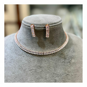 Necklace: The necklace is designed in a sleek and modern choker style, featuring a continuous row of rectangular-cut stones, each set closely together in a rose-gold or gold-toned base. The stones are uniform in size and neatly aligned, creating a shimmering and sophisticated look.Earrings: The matching earrings are designed with the same rectangular-cut stones arranged in a vertical row. They are medium in length, making them versatile for both formal and casual occasions. The earrings complement the necklace perfectly, maintaining the same design theme.Overall Style: The set has a refined, minimalistic yet luxurious appeal, suitable for weddings, parties, and evening occasions. Its timeless design allows it to pair well with both modern and traditional outfits.