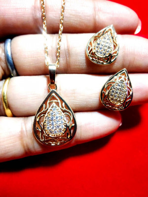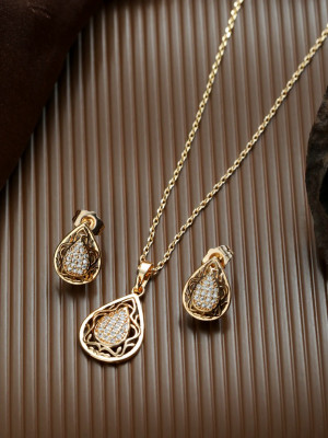 The pendant and earrings feature a teardrop-shaped dual-layer design. The outer frame showcases intricate cut-out patterns in a gold-toned finish, while the inner teardrop is encrusted with sparkling stones that shine brilliantly under any light. The pendant hangs gracefully on a sleek chain, and the earrings mirror the same design, making it a complete and stylish set.Lightweight and comfortable, the earrings are easy to wear all day long without compromising on style. The gold-plated finish ensures long-lasting shine, while the carefully set stones maintain their sparkle over time.