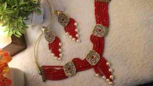 Classic Indian jewelry crafted with ruby red beads, pearls, and gold-toned kundan accents, perfect for weddings and festive occasions. The intricate detailing makes it perfect for Indian wear. The matching earrings complete the traditional yet trendy look.